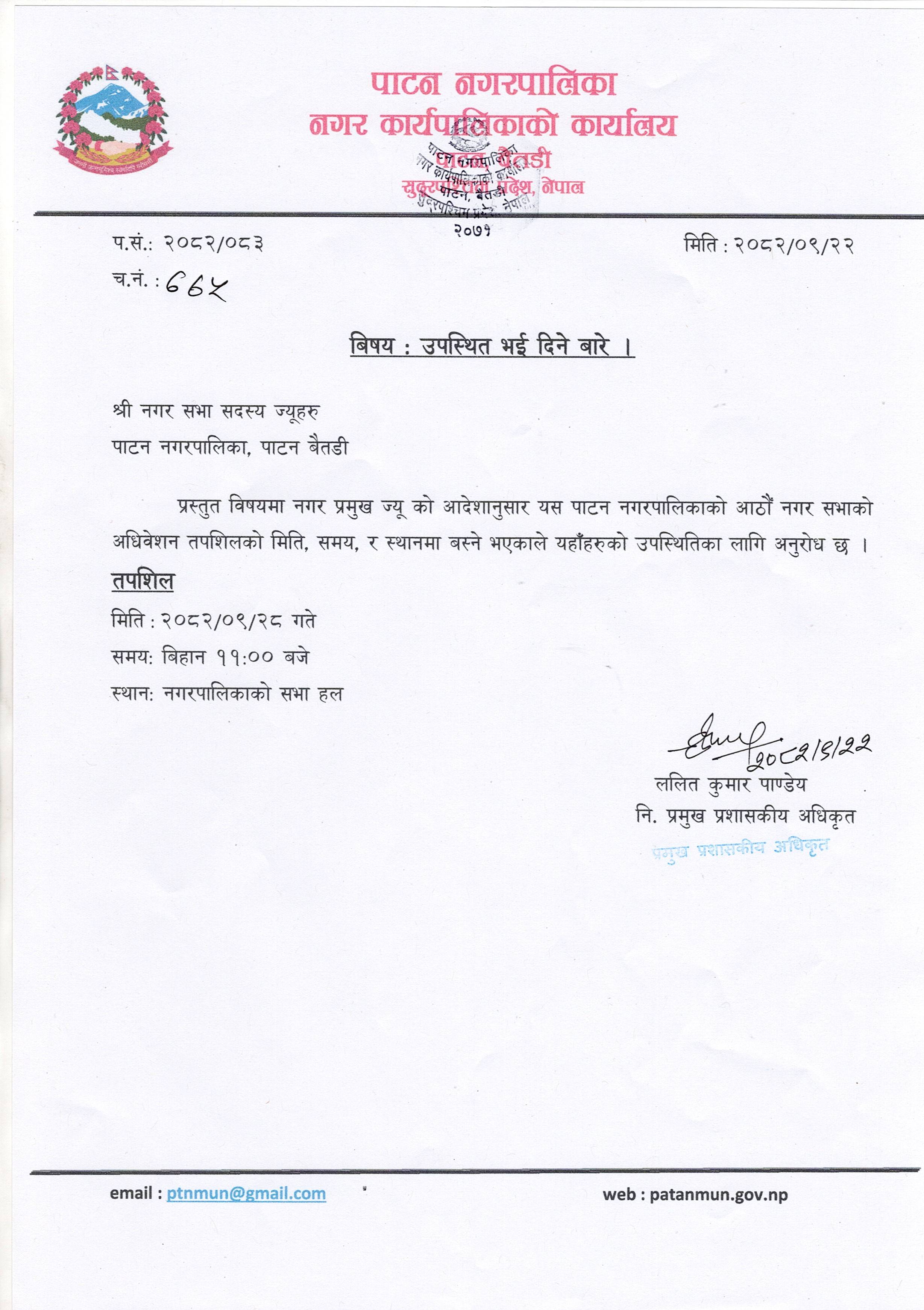 आठौँ नगर सभाको अधिवेशनमा उपस्थित भईदिने बारे सूचना ।