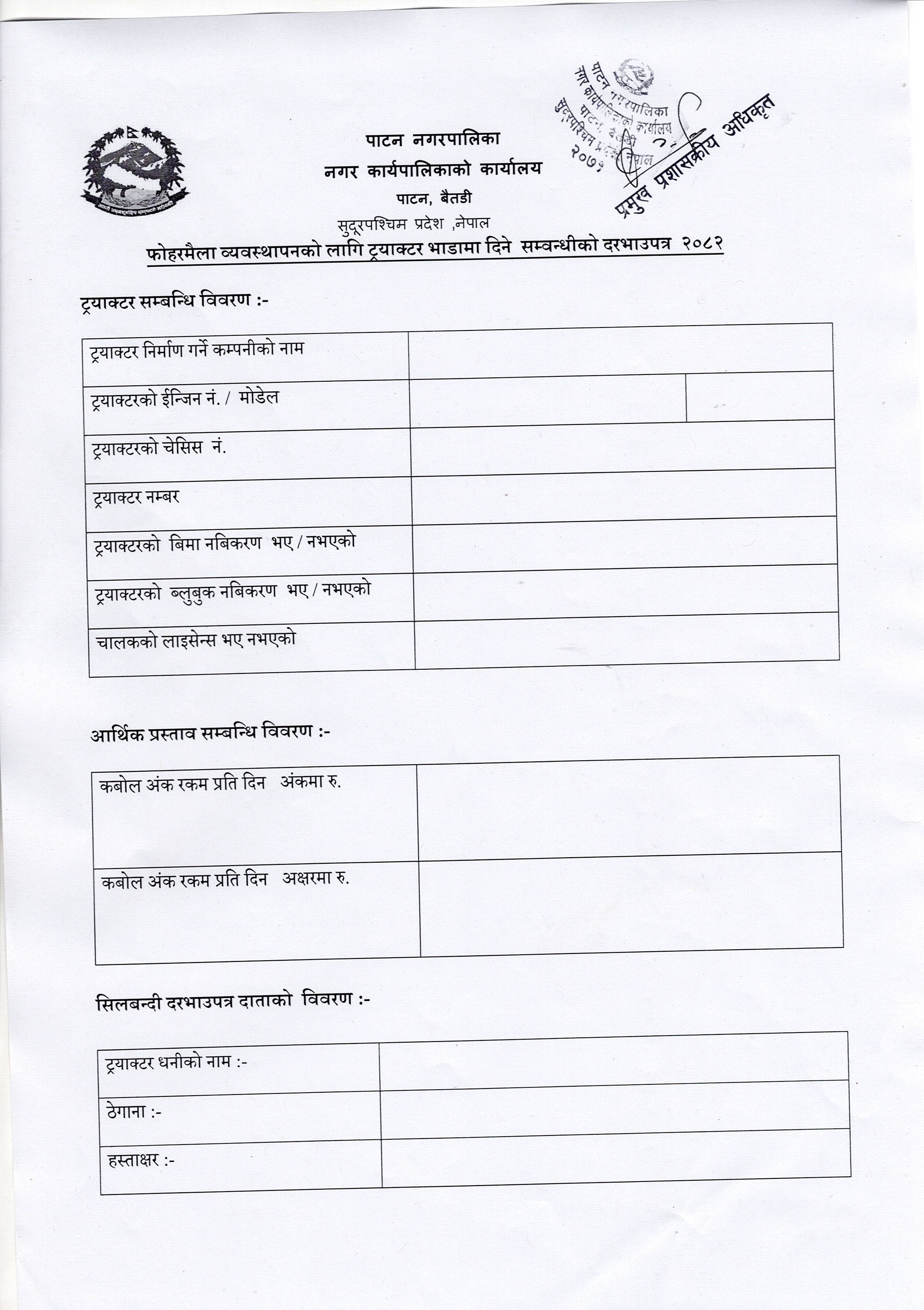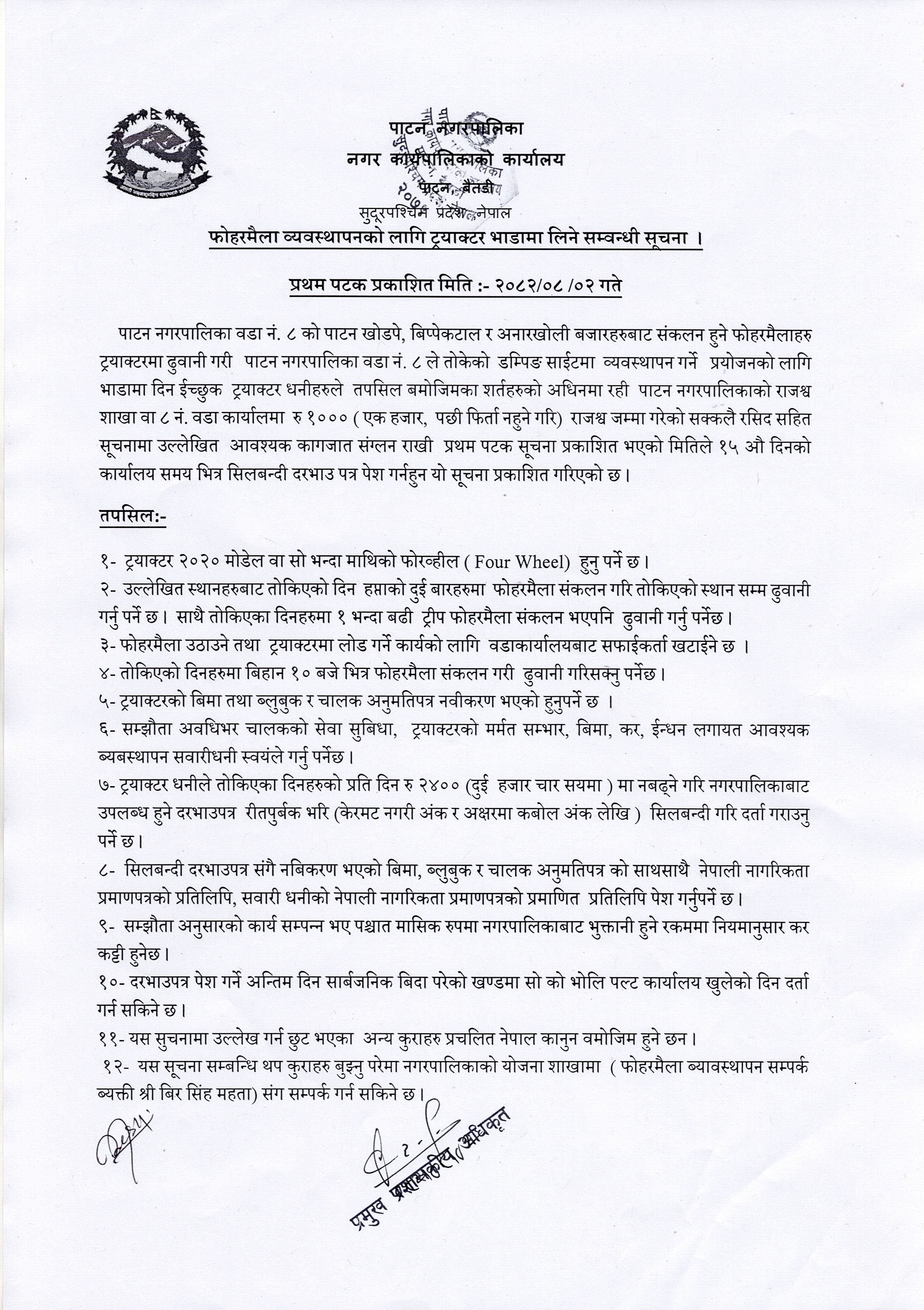फोहरमैला व्यवस्थापनको लागि ट्याकटर भाडामा लिने सम्बन्धी सूचना ।