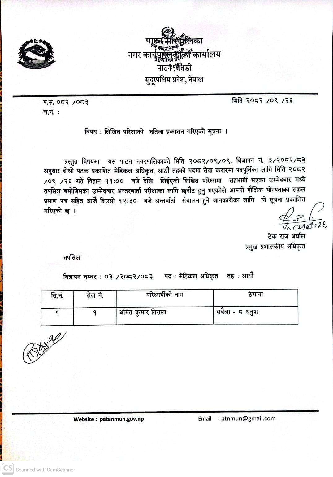 लिखित परिक्षाको नतिजा प्रकाशन गरिएको बारे सूचना ।