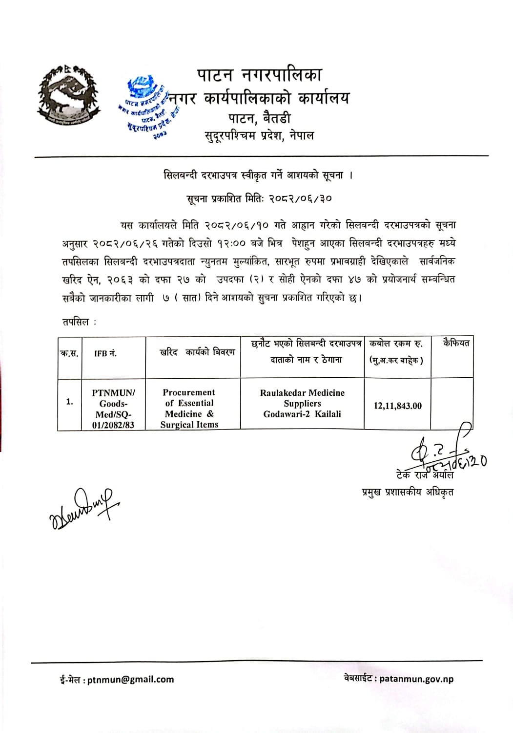 सिलबन्दी दरभाउपत्र स्वीकृत गर्ने आशयको सूचना ।
