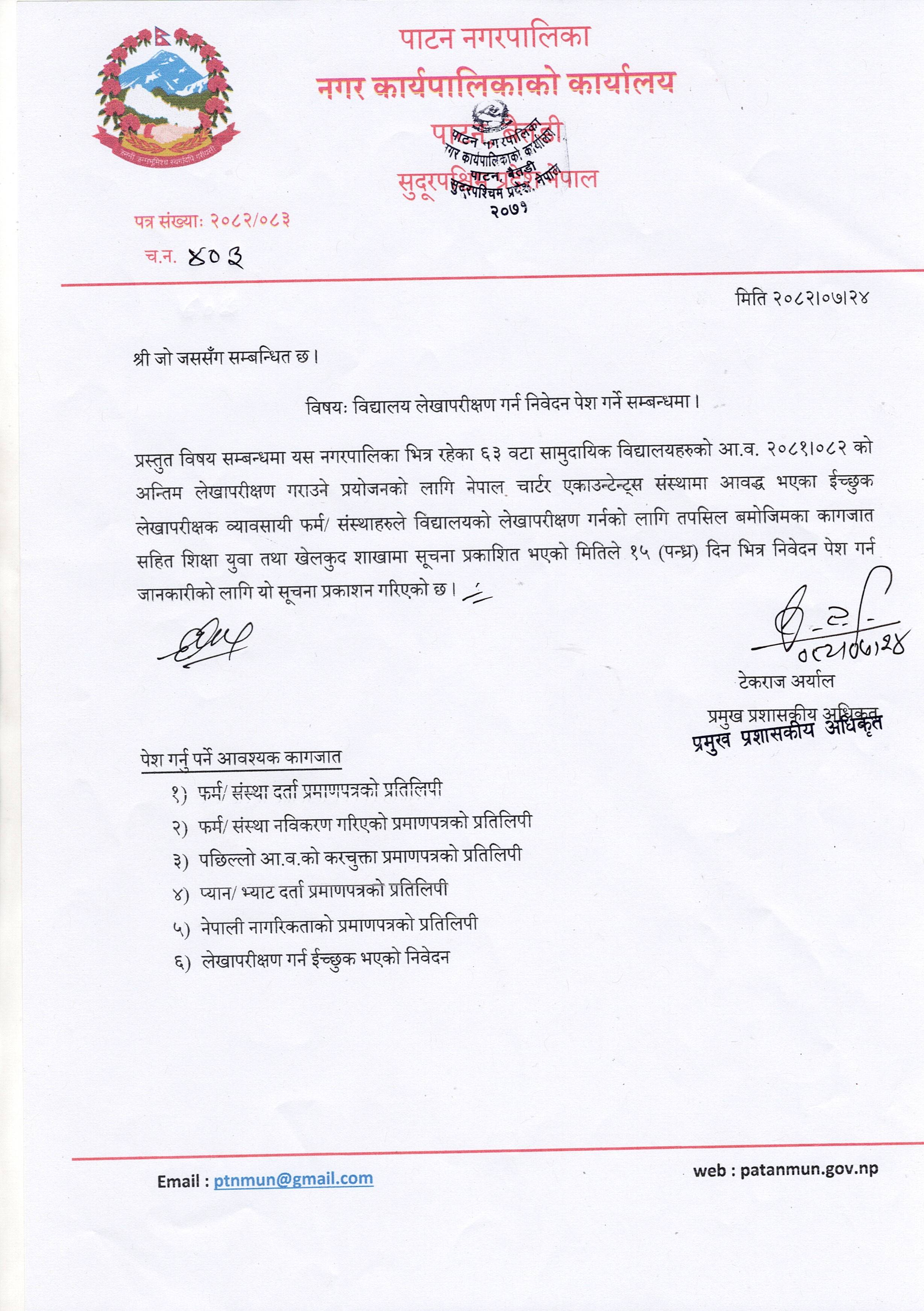 विद्यालय लेखापरिक्षण गर्न निवेदन पेश गर्ने सम्बन्धी सूचना ।